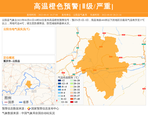 云阳县气象台2022年08月01日10时00分发布高温橙色预警信号:预计8月1日-3日,我县海拔400米以下的地区日最高气温将升至37℃以上,局地可达40℃,请注意防暑降温、防范城镇和森林火灾。 信息来源:国家预警信息发布中心; 发布单位:云阳县气象局。