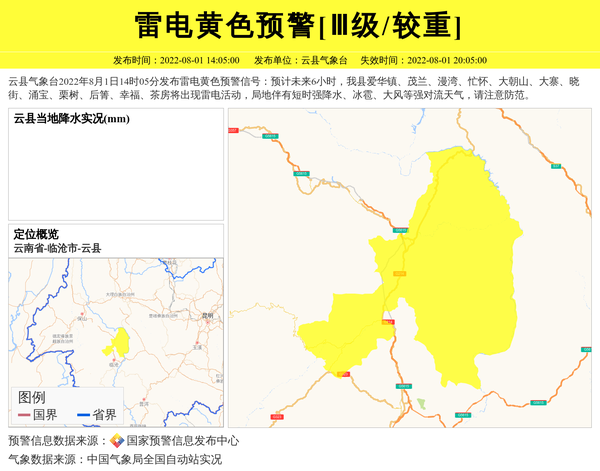 云县气象台2022年8月1日14时05分发布雷电黄色预警信号:预计未来6小时,我县爱华镇、茂兰、漫湾、忙怀、大朝山、大寨、晓街、涌宝、栗树、后箐、幸福、茶房将出现雷电活动,局地伴有短时强降水、冰雹、大风等强对流天气,请注意防范。 信息来源:国家预警信息发布中心; 发布单位:云县气象台。