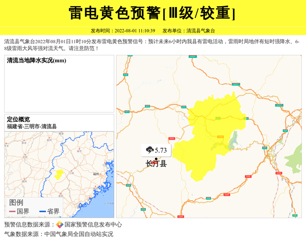 清流县气象台2022年08月01日11时10分发布雷电黄色预警信号:预计未来6小时内我县有雷电活动,雷雨时局地伴有短时强降水、6-8级雷雨大风等强对流天气。请注意防范! 信息来源:国家预警信息发布中心; 发布单位:清流县气象台。