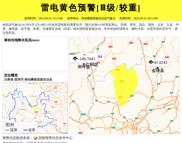禄劝县气象台2022年8月1日14时13分发布雷电黄色预警信号:预计未来6小时我县屏山、崇德、翠华、茂山、团街、云龙、九龙、中屏、撒营盘、皎平渡、则黑、马鹿塘等乡镇(街道)将出现明显雷电活动,并伴有短时强降水、瞬时大风、冰雹等强对流天气,请注意防范。 信息来源:国家预警信息发布中心; 发布单位:禄劝彝族苗族自治县气象台。