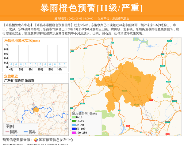 【乐昌预警发布中心】【乐昌市暴雨橙色预警信号】过去3小时,东洛水库已出现超过40毫米的降雨,预计未来1-3小时五山、廊田、北乡、乐城强降雨持续,乐昌市气象台已于08月03日16时01分发布五山镇、廊田镇、北乡镇、乐城街道暴雨橙色预警信号,出行需注意安全,需注意防御持续强降水及其导致的中小河流洪水、山洪、泥石流、山体滑坡等次生灾害。 信息来源:国家预警信息发布中心; 发布单位:乐昌市气象台。