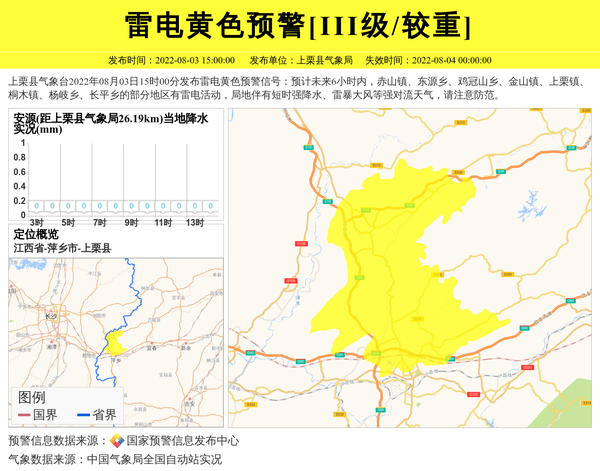 上栗县气象台2022年08月03日15时00分发布雷电黄色预警信号:预计未来6小时内,赤山镇、东源乡、鸡冠山乡、金山镇、上栗镇、桐木镇、杨岐乡、长平乡的部分地区有雷电活动,局地伴有短时强降水、雷暴大风等强对流天气,请注意防范。 信息来源:国家预警信息发布中心; 发布单位:上栗县气象局。