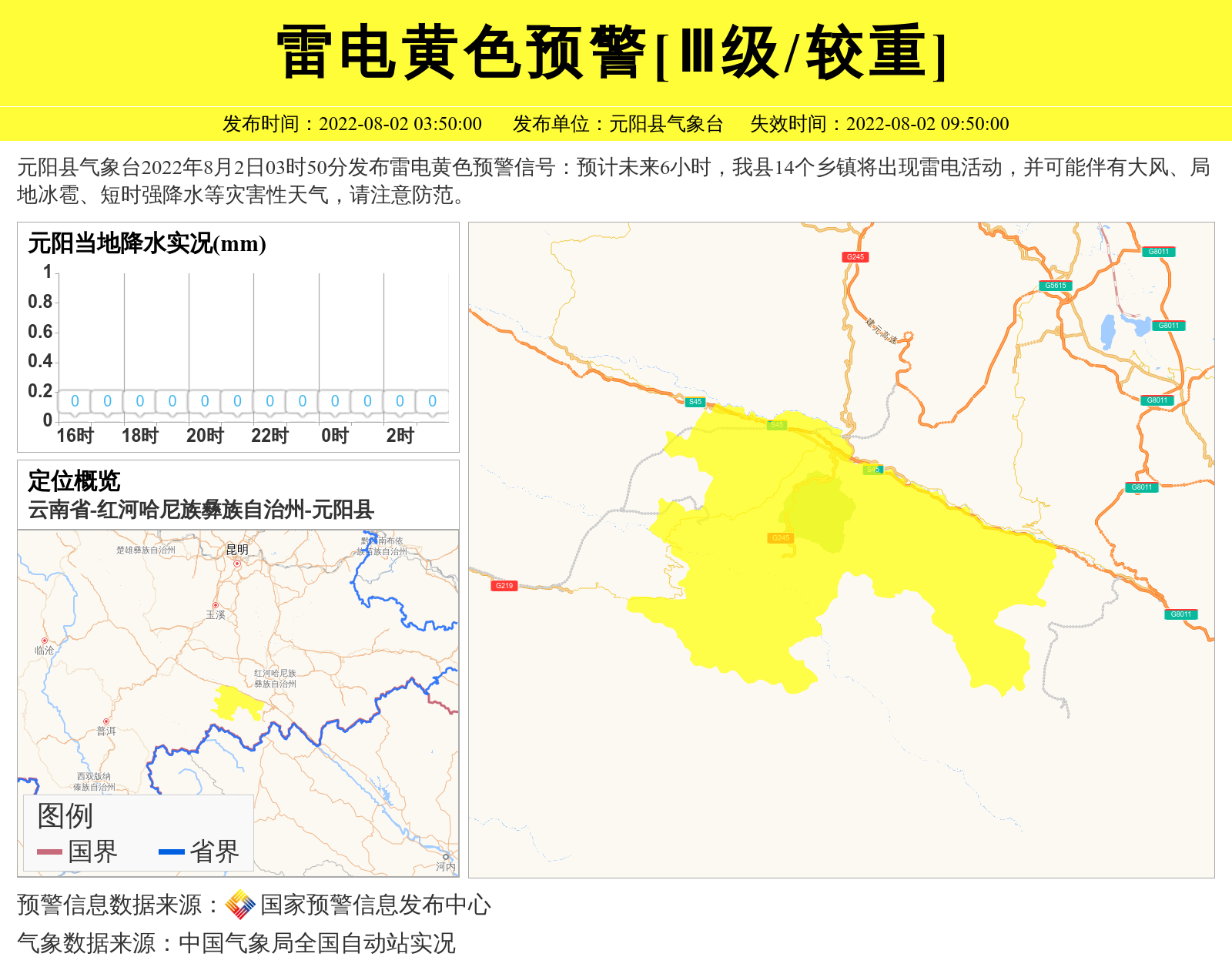 元阳县气象台2022年8月2日03时50分发布雷电黄色预警信号:预计未来6小时,我县14个乡镇将出现雷电活动,并可能伴有大风、局地冰雹、短时强降水等灾害性天气,请注意防范。 信息来源:国家预警信息发布中心; 发布单位:元阳县气象台。