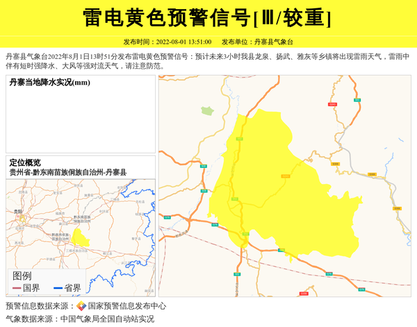 丹寨县气象台2022年8月1日13时51分发布雷电黄色预警信号:预计未来3小时我县龙泉、扬武、雅灰等乡镇将出现雷雨天气,雷雨中伴有短时强降水、大风等强对流天气,请注意防范。 信息来源:国家预警信息发布中心; 发布单位:丹寨县气象台。