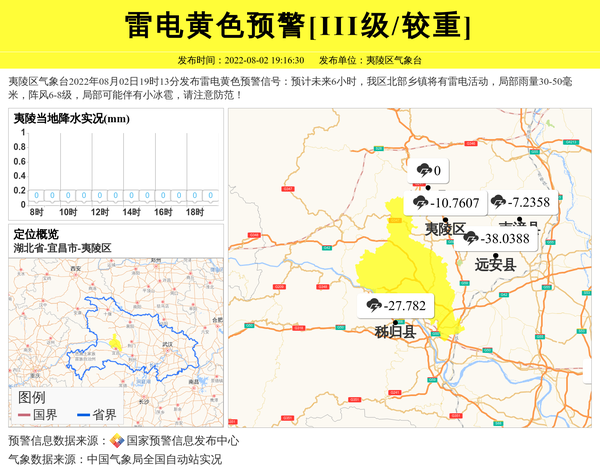 夷陵区气象台2022年08月02日19时13分发布雷电黄色预警信号:预计未来6小时,我区北部乡镇将有雷电活动,局部雨量30-50毫米,阵风6-8级,局部可能伴有小冰雹,请注意防范! 信息来源:国家预警信息发布中心; 发布单位:夷陵区气象台。