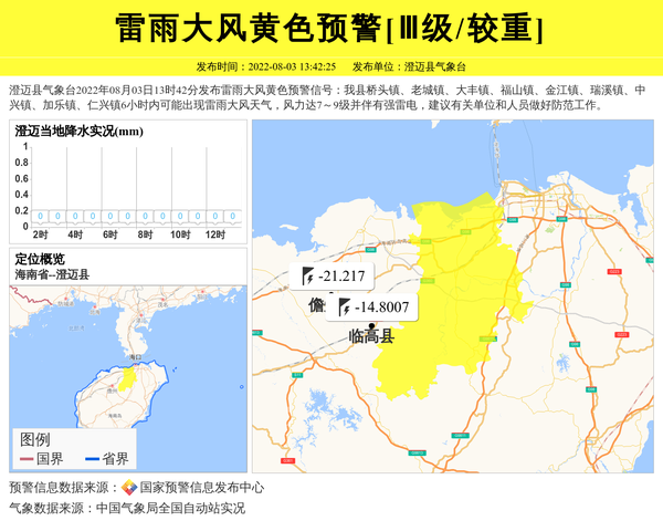 澄迈县气象台2022年08月03日13时42分发布雷雨大风黄色预警信号:我县桥头镇、老城镇、大丰镇、福山镇、金江镇、瑞溪镇、中兴镇、加乐镇、仁兴镇6小时内可能出现雷雨大风天气,风力达7~9级并伴有强雷电,建议有关单位和人员做好防范工作。 信息来源:国家预警信息发布中心; 发布单位:澄迈县气象台。