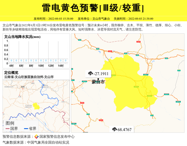 文山市气象台2022年8月3日15时38分发布雷电黄色预警信号:预计未来6小时,我市柳井、古木、平坝、薄竹、德厚、坝心、小街、新街等乡镇将陆续出现雷电活动,局地伴有雷暴大风、短时强降水、冰雹等强对流天气,请注意防范。 信息来源:国家预警信息发布中心; 发布单位:文山市气象台。
