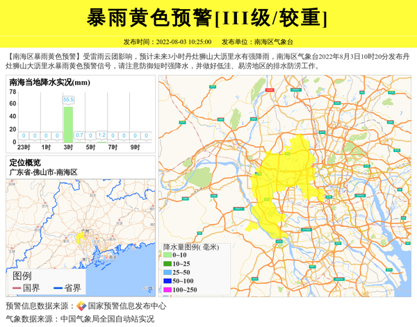 【南海区暴雨黄色预警】受雷雨云团影响,预计未来3小时丹灶狮山大沥里水有强降雨,南海区气象台2022年8月3日10时20分发布丹灶狮山大沥里水暴雨黄色预警信号,请注意防御短时强降水,并做好低洼、易涝地区的排水防涝工作。 信息来源:国家预警信息发布中心; 发布单位:南海区气象台。