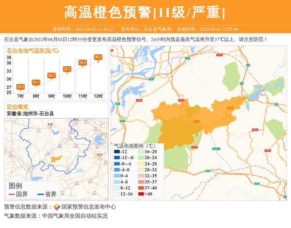 石台县气象台2022年08月02日12时55分变更发布高温橙色预警信号。24小时内我县最高气温将升至37℃以上。请注意防范! 信息来源:国家预警信息发布中心; 发布单位:石台县气象局。