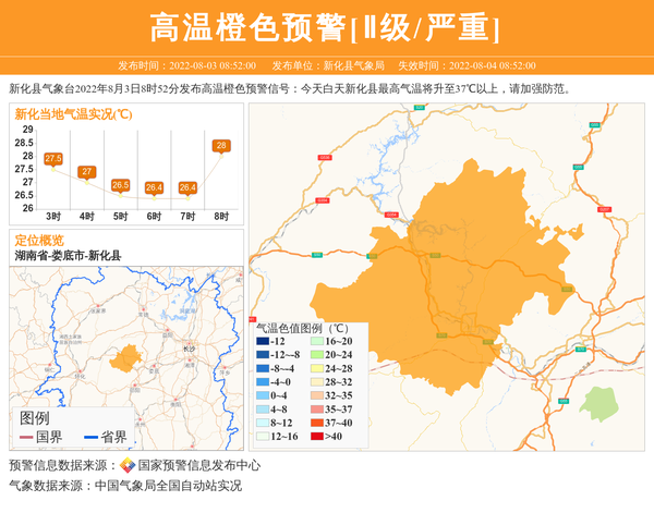 新化县气象台2022年8月3日8时52分发布高温橙色预警信号:今天白天新化县最高气温将升至37℃以上,请加强防范。 信息来源:国家预警信息发布中心; 发布单位:新化县气象局。
