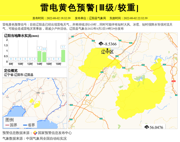 雷电黄色预警信号:目前辽阳县已经出现雷电天气,并将持续2到3小时,同时可能伴有短时大风、冰雹、短时强降水等强对流天气,可能会造成雷电灾害事故,请减少户外活动。辽阳县气象台2022年8月2日19时29分发布 信息来源:国家预警信息发布中心; 发布单位:辽阳县气象局。