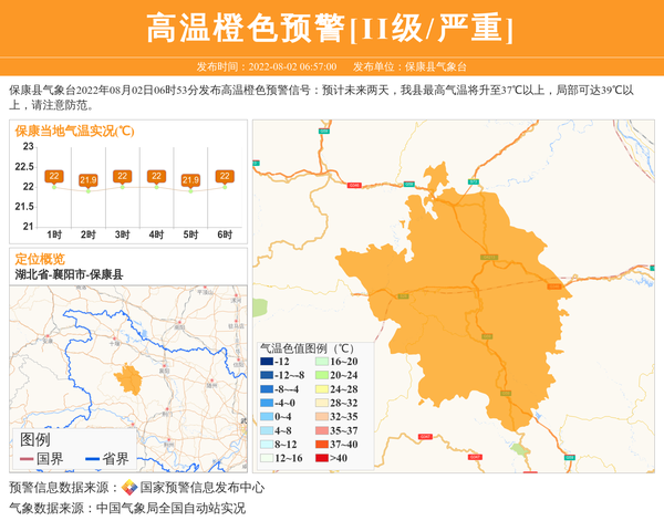 保康县气象台2022年08月02日06时53分发布高温橙色预警信号:预计未来两天,我县最高气温将升至37℃以上,局部可达39℃以上,请注意防范。 信息来源:国家预警信息发布中心; 发布单位:保康县气象台。