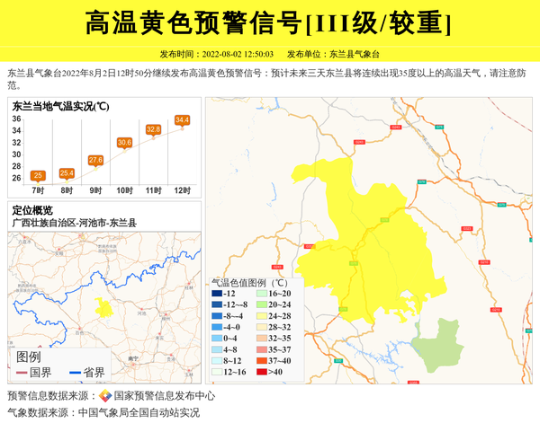 东兰县气象台2022年8月2日12时50分继续发布高温黄色预警信号:预计未来三天东兰县将连续出现35度以上的高温天气,请注意防范。 信息来源:国家预警信息发布中心; 发布单位:东兰县气象台。