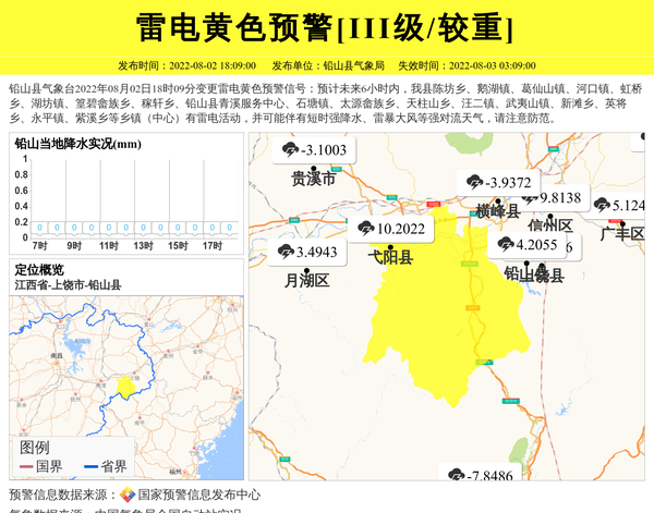 铅山县气象台2022年08月02日18时09分变更雷电黄色预警信号:预计未来6小时内,我县陈坊乡、鹅湖镇、葛仙山镇、河口镇、虹桥乡、湖坊镇、篁碧畲族乡、稼轩乡、铅山县青溪服务中心、石塘镇、太源畲族乡、天柱山乡、汪二镇、武夷山镇、新滩乡、英将乡、永平镇、紫溪乡等乡镇(中心)有雷电活动,并可能伴有短时强降水、雷暴大风等强对流天气,请注意防范。 信息来源:国家预警信息发布中心; 发布单位:铅山县气象局。