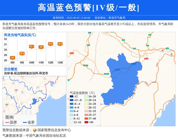 和龙市气象局发布高温蓝色预警信号:预计未来24小时,我市大部分地方最高气温将升至33℃或以上,市应急管理局、市气象局联合提醒注意做好防御工作。 信息来源:国家预警信息发布中心; 发布单位:和龙市气象局。