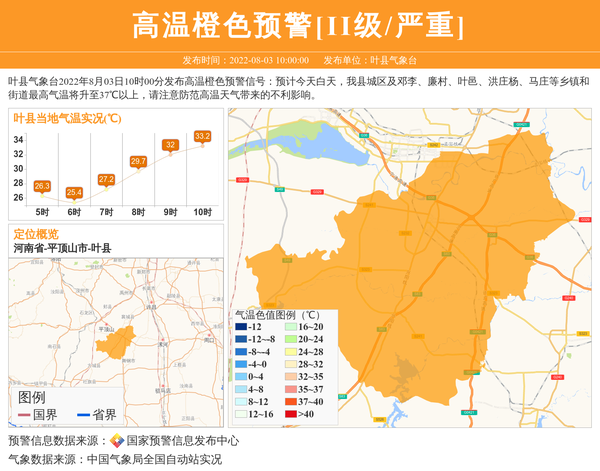 叶县气象台2022年8月03日10时00分发布高温橙色预警信号:预计今天白天,我县城区及邓李、廉村、叶邑、洪庄杨、马庄等乡镇和街道最高气温将升至37℃以上,请注意防范高温天气带来的不利影响。 信息来源:国家预警信息发布中心; 发布单位:叶县气象台。