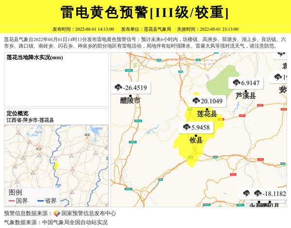 莲花县气象台2022年08月01日14时13分发布雷电黄色预警信号:预计未来6小时内,坊楼镇、高洲乡、荷塘乡、湖上乡、良坊镇、六市乡、路口镇、南岭乡、闪石乡、神泉乡的部分地区有雷电活动,局地伴有短时强降水、雷暴大风等强对流天气,请注意防范。 信息来源:国家预警信息发布中心; 发布单位:莲花县气象局。