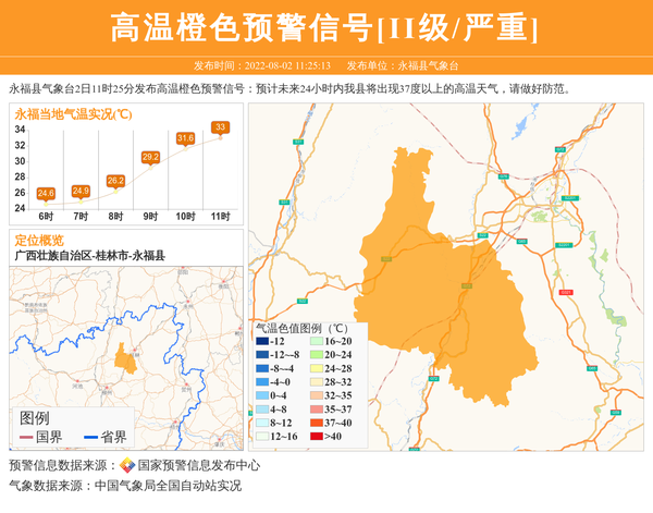 永福县气象台2日11时25分发布高温橙色预警信号:预计未来24小时内我县将出现37度以上的高温天气,请做好防范。 信息来源:国家预警信息发布中心; 发布单位:永福县气象台。