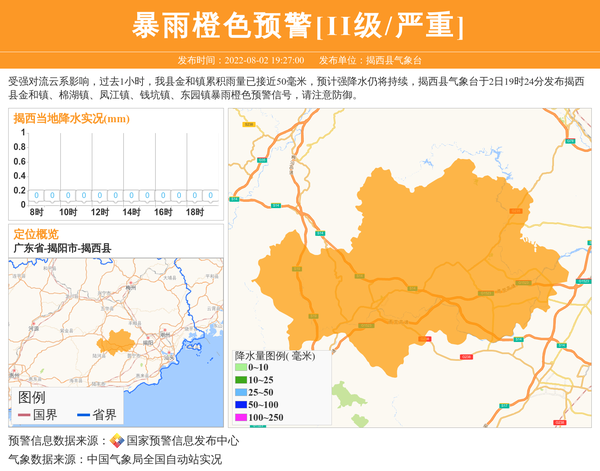 受强对流云系影响,过去1小时,我县金和镇累积雨量已接近50毫米,预计强降水仍将持续,揭西县气象台于2日19时24分发布揭西县金和镇、棉湖镇、凤江镇、钱坑镇、东园镇暴雨橙色预警信号,请注意防御。 信息来源:国家预警信息发布中心; 发布单位:揭西县气象台。