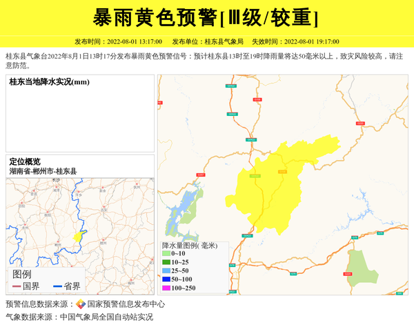桂东县气象台2022年8月1日13时17分发布暴雨黄色预警信号:预计桂东县13时至19时降雨量将达50毫米以上,致灾风险较高,请注意防范。 信息来源:国家预警信息发布中心; 发布单位:桂东县气象局。
