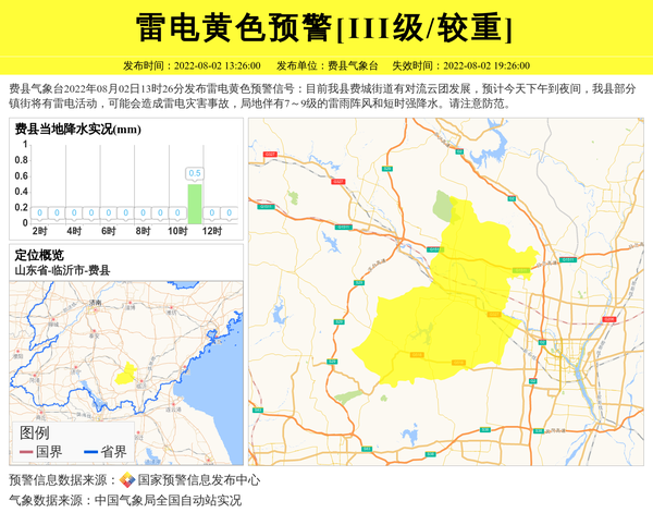 费县气象台2022年08月02日13时26分发布雷电黄色预警信号:目前我县费城街道有对流云团发展,预计今天下午到夜间,我县部分镇街将有雷电活动,可能会造成雷电灾害事故,局地伴有7~9级的雷雨阵风和短时强降水。请注意防范。 信息来源:国家预警信息发布中心; 发布单位:费县气象台。