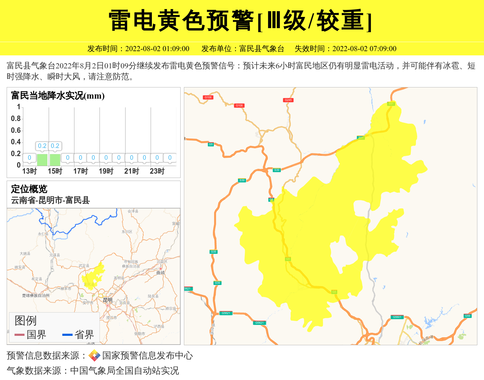 富民县气象台2022年8月2日01时09分继续发布雷电黄色预警信号:预计未来6小时富民地区仍有明显雷电活动,并可能伴有冰雹、短时强降水、瞬时大风,请注意防范。 信息来源:国家预警信息发布中心; 发布单位:富民县气象台。