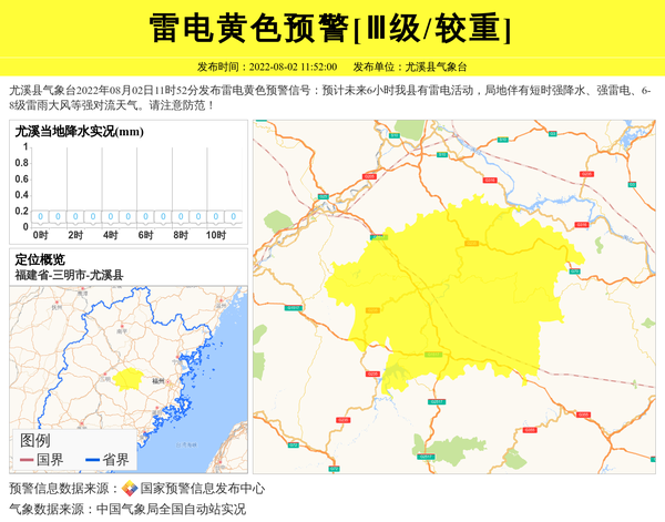 尤溪县气象台2022年08月02日11时52分发布雷电黄色预警信号:预计未来6小时我县有雷电活动,局地伴有短时强降水、强雷电、6-8级雷雨大风等强对流天气。请注意防范! 信息来源:国家预警信息发布中心; 发布单位:尤溪县气象台。