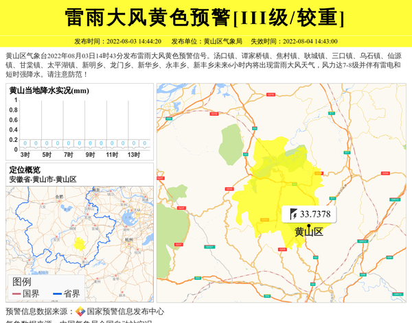 黄山区气象台2022年08月03日14时43分发布雷雨大风黄色预警信号。汤口镇、谭家桥镇、焦村镇、耿城镇、三口镇、乌石镇、仙源镇、甘棠镇、太平湖镇、新明乡、龙门乡、新华乡、永丰乡、新丰乡未来6小时内将出现雷雨大风天气,风力达7-8级并伴有雷电和短时强降水。请注意防范! 信息来源:国家预警信息发布中心; 发布单位:黄山区气象局。