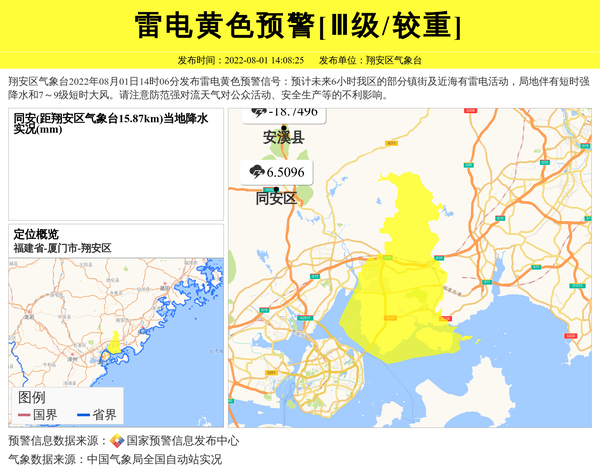 翔安区气象台2022年08月01日14时06分发布雷电黄色预警信号:预计未来6小时我区的部分镇街及近海有雷电活动,局地伴有短时强降水和7~9级短时大风。请注意防范强对流天气对公众活动、安全生产等的不利影响。 信息来源:国家预警信息发布中心; 发布单位:翔安区气象台。