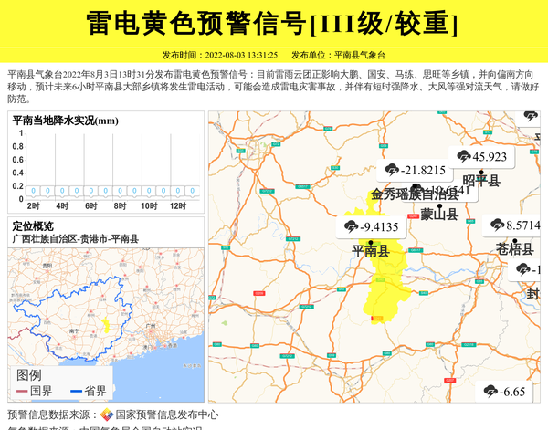 平南县气象台2022年8月3日13时31分发布雷电黄色预警信号:目前雷雨云团正影响大鹏、国安、马练、思旺等乡镇,并向偏南方向移动,预计未来6小时平南县大部乡镇将发生雷电活动,可能会造成雷电灾害事故,并伴有短时强降水、大风等强对流天气,请做好防范。 信息来源:国家预警信息发布中心; 发布单位:平南县气象台。