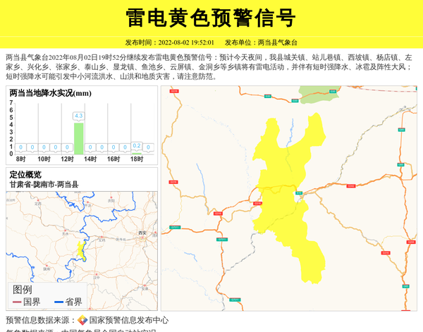 两当县气象台2022年08月02日19时52分继续发布雷电黄色预警信号:预计今天夜间,我县城关镇、站儿巷镇、西坡镇、杨店镇、左家乡、兴化乡、张家乡、泰山乡、显龙镇、鱼池乡、云屏镇、金洞乡等乡镇将有雷电活动,并伴有短时强降水、冰雹及阵性大风;短时强降水可能引发中小河流洪水、山洪和地质灾害,请注意防范。 信息来源:国家预警信息发布中心; 发布单位:两当县气象台。