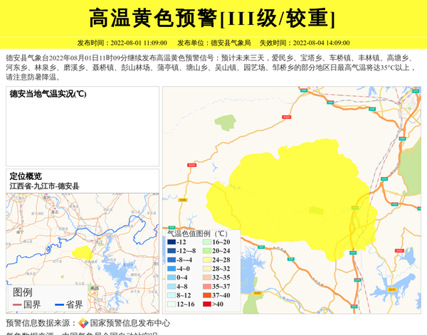 德安县气象台2022年08月01日11时09分继续发布高温黄色预警信号:预计未来三天,爱民乡、宝塔乡、车桥镇、丰林镇、高塘乡、河东乡、林泉乡、磨溪乡、聂桥镇、彭山林场、蒲亭镇、塘山乡、吴山镇、园艺场、邹桥乡的部分地区日最高气温将达35°C以上,请注意防暑降温。 信息来源:国家预警信息发布中心; 发布单位:德安县气象局。