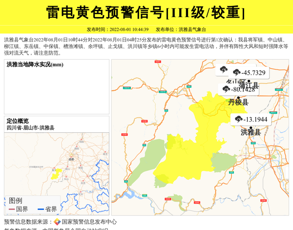 洪雅县气象台2022年08月01日10时44分对2022年08月01日04时25分发布的雷电黄色预警信号进行第1次确认:我县将军镇、中山镇、柳江镇、东岳镇、中保镇、槽渔滩镇、余坪镇、止戈镇、洪川镇等乡镇6小时内可能发生雷电活动,并伴有阵性大风和短时强降水等强对流天气,请注意防范。 信息来源:国家预警信息发布中心; 发布单位:洪雅县气象台。