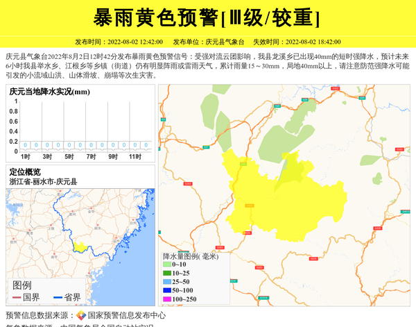 庆元县气象台2022年8月2日12时42分发布暴雨黄色预警信号:受强对流云团影响,我县龙溪乡已出现40mm的短时强降水,预计未来6小时我县举水乡、江根乡等乡镇(街道)仍有明显阵雨或雷雨天气,累计雨量15~30mm,局地40mm以上,请注意防范强降水可能引发的小流域山洪、山体滑坡、崩塌等次生灾害。 信息来源:国家预警信息发布中心; 发布单位:庆元县气象台。