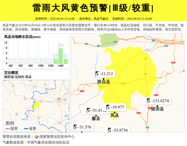 凤县气象台2022年08月04日15时16分发布雷雨大风黄色预警信号:预计未来6小时内,我县红花铺镇、河口镇、平木镇、坪坎镇、留凤关镇、双石铺镇、唐藏镇、黄牛铺镇、凤州镇将受雷雨大风影响,阵风可达6级或以上并伴有雷电、局地短时暴雨。请注意防范。 信息来源:国家预警信息发布中心; 发布单位:凤县气象台。