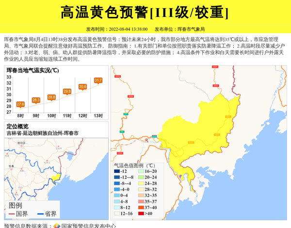 珲春市气象局发布高温黄色预警[III级/较重] 相关文章