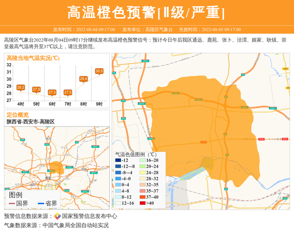 高陵区气象台2022年08月04日09时17分继续发布高温橙色预警信号:预计今日午后我区通远、鹿苑、张卜、泾渭、姬家、耿镇、崇皇最高气温将升至37℃以上,请注意防范。 信息来源:国家预警信息发布中心; 发布单位:高陵区气象台。