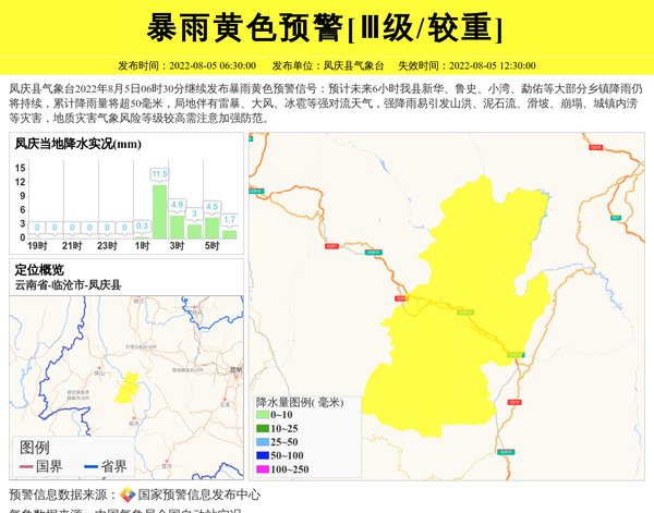 凤庆县气象台2022年8月5日06时30分继续发布暴雨黄色预警信号:预计未来6小时我县新华、鲁史、小湾、勐佑等大部分乡镇降雨仍将持续,累计降雨量将超50毫米,局地伴有雷暴、大风、冰雹等强对流天气,强降雨易引发山洪、泥石流、滑坡、崩塌、城镇内涝等灾害,地质灾害气象风险等级较高需注意加强防范。 信息来源:国家预警信息发布中心; 发布单位:凤庆县气象台。