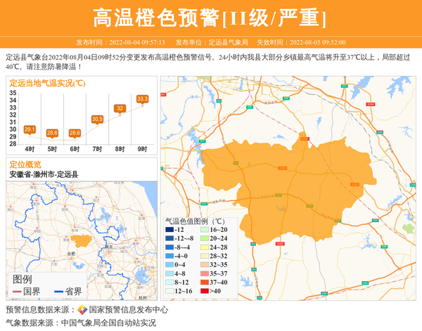 定远县气象台2022年08月04日09时52分变更发布高温橙色预警信号。24小时内我县大部分乡镇最高气温将升至37℃以上,局部超过40℃。请注意防暑降温! 信息来源:国家预警信息发布中心; 发布单位:定远县气象局。