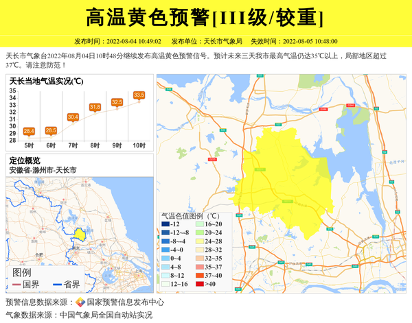 天长市气象台2022年08月04日10时48分继续发布高温黄色预警信号。预计未来三天我市最高气温仍达35℃以上,局部地区超过37℃。请注意防范! 信息来源:国家预警信息发布中心; 发布单位:天长市气象局。