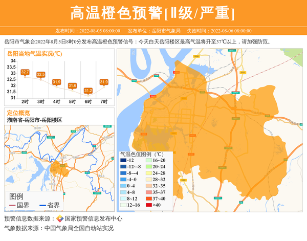岳阳市气象台2022年8月5日8时0分发布高温橙色预警信号:今天白天岳阳楼区最高气温将升至37℃以上,请加强防范。 信息来源:国家预警信息发布中心; 发布单位:岳阳市气象局。