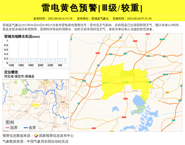 容城县气象台2022年08月04日01时47分发布雷电黄色预警信号:受对流天气影响,目前我县已出现雷阵雨天气,预计未来6小时内,我县全部乡镇仍有雷阵雨,雷雨时伴有短时强降水、短时大风等强对流天气,请有关单位和人员做好防范准备。 信息来源:国家预警信息发布中心; 发布单位:容城县气象台。