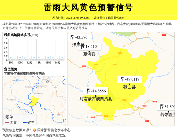 碌曲县气象台2022年08月03日19时20分继续发布雷雨大风黄色预警信号:预计6小时内,我县大部乡镇可能受雷雨大风影响,平均风力可达6级以上,并伴有强雷电。请有关单位和人员做好防范准备! 信息来源:国家预警信息发布中心; 发布单位:碌曲县气象台。