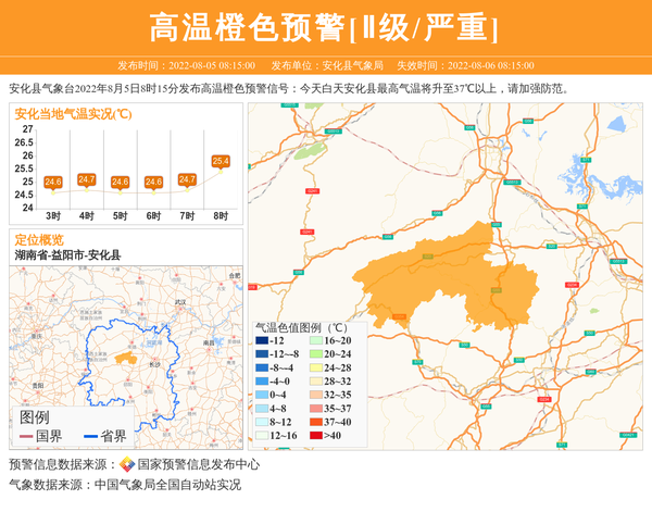 安化县气象台2022年8月5日8时15分发布高温橙色预警信号:今天白天安化县最高气温将升至37℃以上,请加强防范。 信息来源:国家预警信息发布中心; 发布单位:安化县气象局。