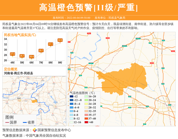 民权县气象台2022年08月04日09时58分继续发布高温橙色预警信号:预计今天白天,我县绿洲街道、南华街道、孙六镇等全部乡镇和街道最高气温将升至37℃以上。请注意防范高温天气对户外作业、疫情防控、出行等带来的不利影响。 信息来源:国家预警信息发布中心; 发布单位:民权县气象局。