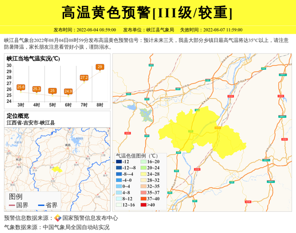 峡江县气象台2022年08月04日08时59分发布高温黄色预警信号:预计未来三天,我县大部分乡镇日最高气温将达35°C以上,请注意防暑降温,家长朋友注意看管好小孩,谨防溺水。 信息来源:国家预警信息发布中心; 发布单位:峡江县气象局。