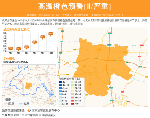 成武县气象台2022年08月05日10时21分继续发布高温橙色预警信号:预计今天白天到7日我县所辖镇街最高气温将达37℃以上,局部可达39℃,此次高温过程湿度大,体感温度高,持续时间长,请注意防范! 信息来源:国家预警信息发布中心; 发布单位:成武县气象台。