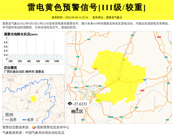 鹿寨县气象台2022年8月4日11时22分发布雷电黄色预警信号:预计未来6小时内鹿寨县将发生雷电活动,可能会造成雷电灾害事故,并可能伴有短时强降雨、大风等强对流天气,请做好防范。 信息来源:国家预警信息发布中心; 发布单位:鹿寨县气象台。