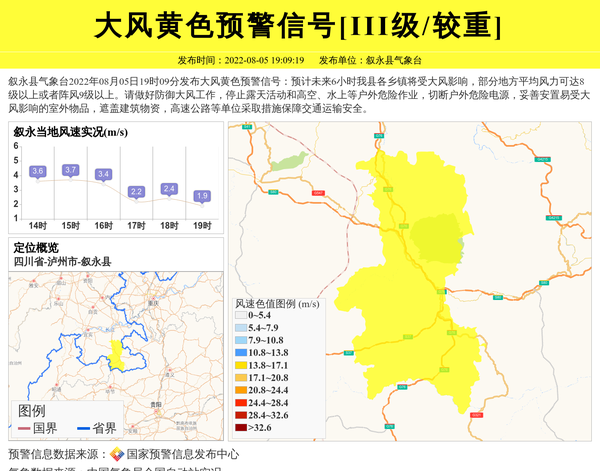 叙永县气象台2022年08月05日19时09分发布大风黄色预警信号:预计未来6小时我县各乡镇将受大风影响,部分地方平均风力可达8级以上或者阵风9级以上。请做好防御大风工作,停止露天活动和高空、水上等户外危险作业,切断户外危险电源,妥善安置易受大风影响的室外物品,遮盖建筑物资,高速公路等单位采取措施保障交通运输安全。 信息来源:国家预警信息发布中心; 发布单位:叙永县气象台。