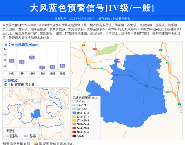 兴文县气象台2022年08月05日19时23分发布大风蓝色预警信号:预计我县五星镇、周家镇、石海镇、九丝城镇、莲花镇、共乐镇、僰王山镇、古宋镇、仙峰苗族乡、麒麟苗族乡、大河苗族乡、大坝苗族乡24小时内可能受大风影响,平均风力可达6级以上或者阵风7级以上。请注意关好门窗,加固围板、棚架、广告牌等搭建物。注意行路、行车安全,刮风时不要在广告牌、临时搭建物等下面逗留,暂停露天集体活动和水上作业。 信息来源:国家预警信息发布中心; 发布单位:兴文县气象台。